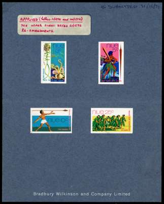 NIUE: 1972 Arts Festival set of 4 imperforate colour proofs affixed to Bradbury Wilkinson card endorsed “AS SUBMITTED