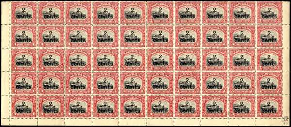 1916 2c Type 67 on 3c black and rose-lake bottom five rows of sheet, fifty stamps, giving two complete settings. Unmounted o.g. with lightly toned gum, containing two examples of the R2/5 inverted ‘S'. Minor foxing affects the top of four stamps in the top row, still a fine multiple. SG 186, a, £1660