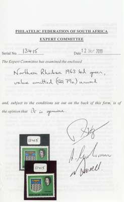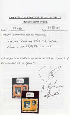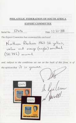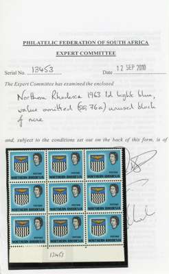 Northern Rhodesia 1963 1d light blue block of 9, 3d and 4d value omitted and 3d value and orange eagle omitted, all with PFSA