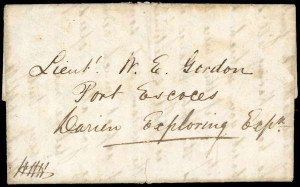 1853 (Dec 29) privately carried entire letter written by William H Hills aboard HMS Virago, addressed to ‘Lieut W(?). E. GORDON/ Port Escoces/ Darien Exploring Exp(edition). The Virago, having visited Pitcairn Island earlier in the year, was engaged in an early expedition across the isthmus of Darien in Panama, surveying the land to explore the practicability of what became the Panama Canal. The complete intact contents thank the recipient for supplies “Your last Pig died a violent death yesterday and today his mortal remains are no more”, gives details of a Christmas dinner 4 days prior referencing a Turkey “this fellow has got his feathers on so there is no mistaking him for a monkey” and requests further supplied "grub is getting very short here… we have only a sheep left". A charming piece of history of the South America station of the Royal Navy.