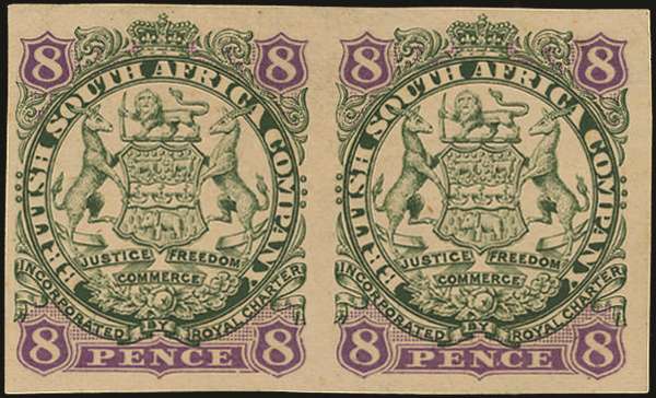 Rhodesia 1896 8d green and mauve on buff, IMPERFORATE PAIR, SG 34b Mint