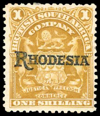 Rhodesia1909 1s bistre-brown with ‘NO STOP (ALBINO IMPRESSION)’ after RHODESIA, fine large part og