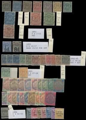 1892 to 1924 mint selection on stockcards including 1892 to £1, £2 used, £5 and £10 (perfin), 1892 ½d on 6d and 8d on 1s, 1892-94 to 4s, 1896-97 to 4s, and ½d to 10s, 1896 1d on 3d, ½d to 1s, 1897 to £1, 1897 £2 perfin, 1898-1908 to 10s, £1 overprinted “SPECIMEN”, £2, 1905 to 5s, 1909 to £1, and to 2s on 5s, 1910-13 double heads values to 1s, , 2s6d, 3s, 5s and 10s: 2s, 7s6d and £1 used, 1913-24 Admirals to £1. Slightly mixed with many good to fine. (157) SG 1/242