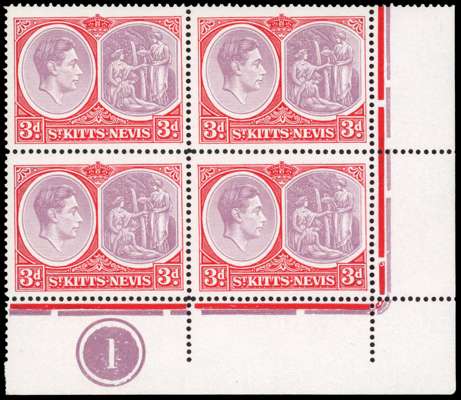 1947 3d purple and bright scarlet on ordinary paper lower right corner block of four with Plate 1, R12/5 break in value tablet, fine unmounted o.g. SG 73d, da, £464