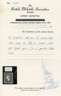 1885/93 perf 14, 6d colour trial in carmine-lake on watermarked, gummed paper, with BPA certificate (1974) fine. Ex Jaffe and ‘Tatiana’