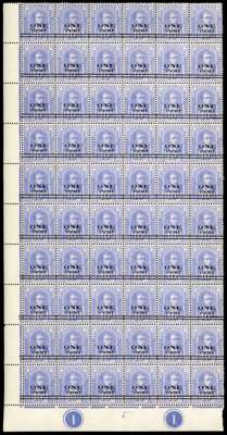 1923 1c on 10c dull blue pane of 60, with left and lower selvedge (two Plate 1s at base). R9/5 “cnet” error, and the right column showing doubling POSTAGE and frame (shifted decoupage), Unmounted o.g. save for the top row; a few gum bursts and some very small toned spots on the gum. SG 72, a, £897