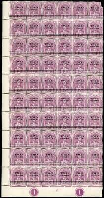 1923 2c on 12c purple (first printing) pane of 60, with left and lower selvedge (two Plate 1s). The two lower rows show the thick narrower ‘W’. Hinged on the top row only (top right stamp damaged), otherwise unmounted o.g., some splitting at right; small toned spots affect about seven stamps, not the lower two rows. SG 73, a, £592