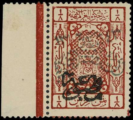 NEJD OCCUPATION OF HEJAZ: 1925 1⁄8p chestnut Newspaper Stamp, black overprint, large part o.g., trivial gum wrinkle, marginal example (thin on selvedge, not affecting stamp), A. Eid handstamp on reverse, a rare stamp (SG N208a)
