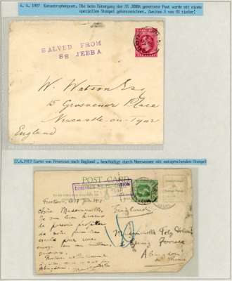 POSTAL HISTORY: DISASTER MAIL: 1907 KEVII 1d red postal stationery envelope to England cancelled by ‘FREETOWN 4 MR 07’ cds and handstamped ‘SALVAGED FROM SS JEBBA’ in violet and 1917 postcard to England franked with KGV ½d tied by ‘JU 18 17’, the other stamp soaked off, handstamped with boxed ‘DAMAGED BY IMMERSION IN SEA WATER’ in violet. An interesting pair