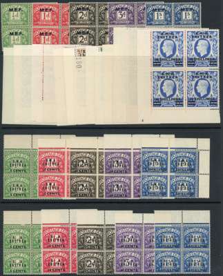 MEF, Eritrea, Somalia and Tripolitania blocks unmounted o.g. MEF Dues; Eritrea BMA set and both sets of Dues; Somalia EAF and BMA sets; Tripolitania BMA set and BMA Dues. All the Dues are fine; of the regular issues, the lower values are fine, but the high values (while of fine appearance) have somewhat two-toned gum. Catalogued £1846