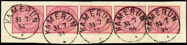 Kamerun 1894 (31 7) 2m parcel stamp in horizontal strip of five on piece with good quality cds, fine and fresh. Mi V37e