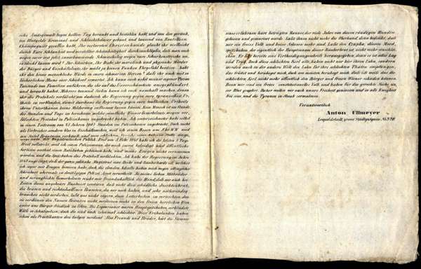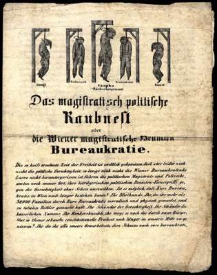 Austria 1848-49 Viennese illustrated three-sided flier showing named bureaucrats hung, a long message attacking the incompetence or dishonesty of the Viennese bureaucracy; folded with some slight paper toning