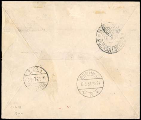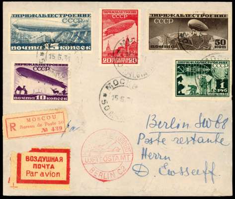 Russia (15.5.) registered airmail Zeppelin cover to Berlin bearing imperforate set of five tied by Moscow cds, red Berlin Air Cachet at base, arrival backstamps; envelope torn at back on left, clean condition, stamps with good to large margins