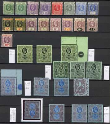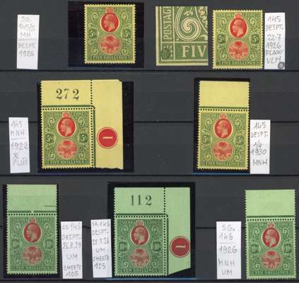 1921-7 mint collection, one of each low value to 10d plus shades, with a nice group of the 1s to 10s values. The latter includes unmounted upper right corner examples of each with Plate number, the 5s and 10s with sheet number; five shades of the 1s; 2s with flaw on right value, another with inverted watermark, and four shades (one heavily hinged); 5s with flaw on lower left ornament, and examples identified as from the 1926 and 1930 despatches, the latter unmounted; and two 10s examples each unmounted, identified as from the 1926 and 1929 despatches. A pleasing group. SG 131-146