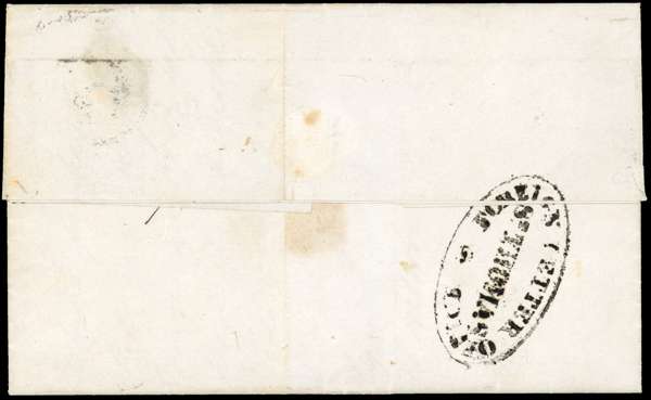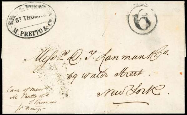 1853 double forwarding entire, written in Baranquilla, Colombia, carried to St Thomas where ‘Rec’d and Forwarded' M Pretto & Co/ St Thomas handstamp applied, handed over to the Foreign Letter Office/ St Thomas and a circular framed ‘6’ charge handstamp applied on arrival, docketed as sent on December 21st, arriving March 2nd