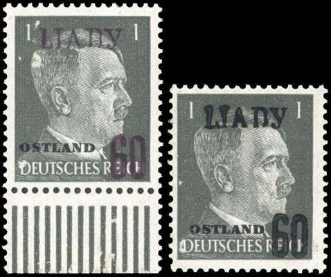 Ljady 1941 60 (K) on 1pf Hitler Head, two examples, one with black surcharge with some adherences on gum and small surface abrasion by ‘D’ of ‘Deutsches’ plus another example violet-black, bottom marginal, again with some surface abrasions with some disturbed gum.