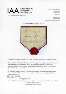 ROYALTY: Queen Victoria privately carried envelope front (mounted on thin card) to to Queen Adelaide (widow of King William IV), signed by 'The Queen' at lower left, the Royal Seal on the flap in red wax. Fine and scarce. IAA Certificate (2015)