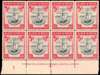 1943 10/- blue-black and carmine (narrow) imprint and FP1 block of eight, o.g., lightly hinged on two only. SG 163e, £400