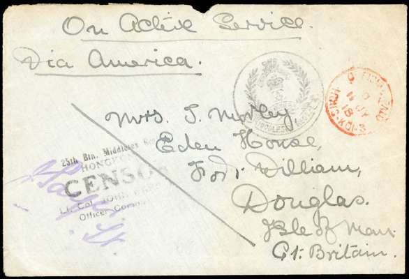 1918 stampless censored cover to the Isle of Man marked ‘On Active Service/Via America’, cancelled by official paid cds in red, ornate MIDDLESEX REG’T cachet alongside and at lower left rare ‘25th Btn. Middlesex Regt./HONG HONG/CENSOR/Lt. JOHN WARD, M.P./Officer Commanding’ handstamp, initialled. Fine and very scarce