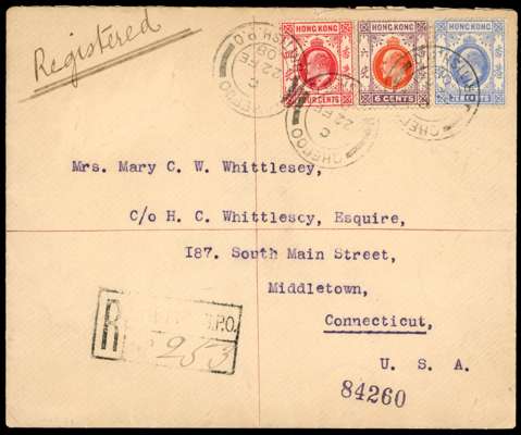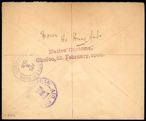 TREATY PORTS: 1908 registered cover to USA franked with KEVII 4c, 6c, 10c tied by Chefoo double-ring ds, backstamped with ‘Native Customs,/Chefoo, 22. February, 1908.’ handstamp in red, San Francisco (28.3) transit and Middletown, Conn (2.4) arrival cancels in purple. Attractive