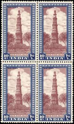 1949-52 10r purple-brown & deep blue ‘Qutb Minar, Delhi' block of four, mint unmounted o.g., very fine. SG 323, £640+