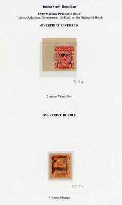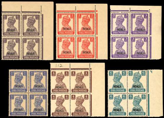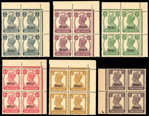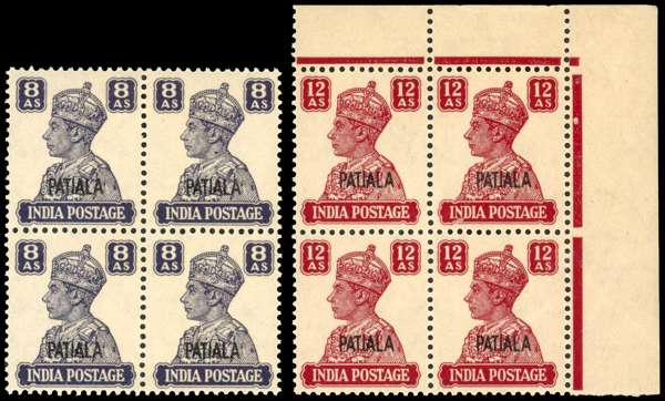 India Patiala 1940-43 White Back set o3 13 in mostly marginal blocks of four, tone paper, full o.g., Rajasthan 1948-49 violet overprinted 8a block of 20 inverted handstamp,with margins on three sides, fine full o.g., , also with four modern Pigeongrammes.