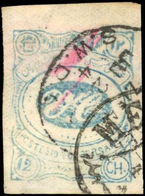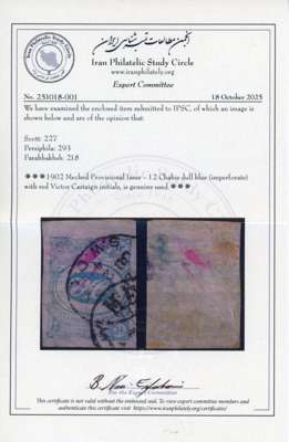 Meshed 1902 12ch light blue, a top marginal example with other good even margins, used with part Meshed cds and large part Registered London date stamp, reddish-pink initials, a rare postally used stamp with Iran Philatelic Study Circle Certificate (2025)