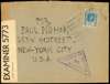 WW2 envelope to New York bearing 20c blue with Cable and Wireless slogan, censor tape at left and a very good strike of violet triangular B2 Censor cachet. Internment Camp mail, return address Post-Box 1000. Reduced at top, which has small faults