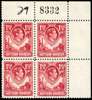 1938-41 1½d carmine-red top right corner block of four with sheet number, unmounted o.g. R2/9-10 strong ‘T’ guidelines in Crown. SG 29 var