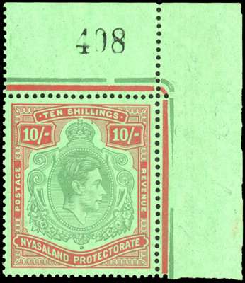 1938 10/- ordinary paper upper right corner example with sheet number 408, unmounted o.g. Shows break in frame above Crown; ex Twynam. SG 142a, £425
