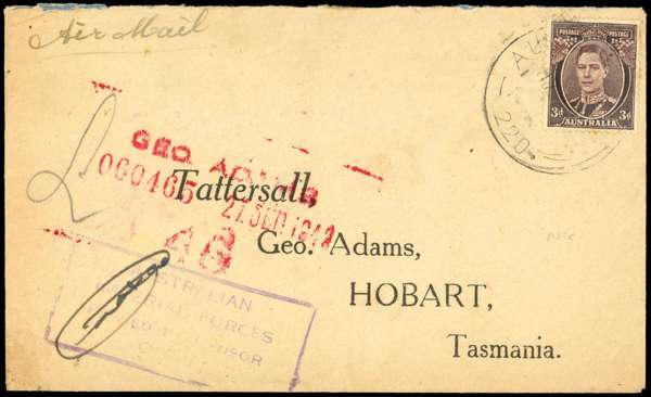 Australian Forces. 1943 envelope to Tattersalls bearing Australia 3d, fair AUST UNIT POSTAL STN 220 CDS (number very clear), based on New Guinea, fair boxed AUSTRALIAN IMPERIAL FORCES PASSED BY CENSOR (number unclear) at base, the stamps with slight foxing on a few perfs