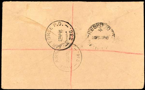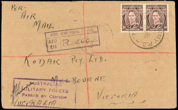 Australian Forces. 1945 registered envelope to Melbourse bearing Australia 3d pair, cancelled by AUST UNIT POSTAL STN 214 CDS, stationed at Finschhafen; fine boxed violet AUSTRALIAN MILITARY FORCES PASSED BY CENSOR (number only partially printed) and AAPS APO 214 registered cachet. AFPO 236 transit on reverse. Envelope with small faults, still good
