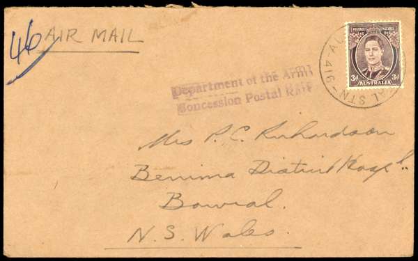 Australian Forces. 1945 envelope to Bowral bearing Australia 3d, cancelled by AUST UNIT POSTAL STN 416 CDS of 19 NO, with violet “Department of the Army/ Concession Postal Rate” cachet alongside