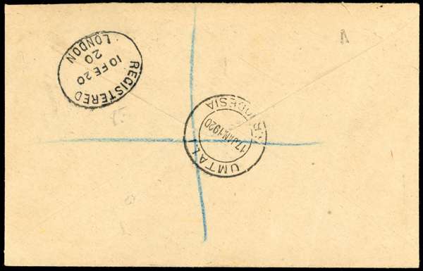1920 registered printed envelope to Huddersfield with Admiral 6d Die IIIB, tied by very fine Umtali cds of 17 JAN and backstamped by London Registered oval for 10 FE. Neat.