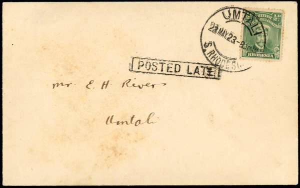 1923 envelope used locally at Umtali, bearing ½d Admiral (paying unsealed printed matter rate) with 23 MAY 23 cds and boxed ‘POSTED LATE’ handstamp alongside. Light staining.
