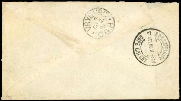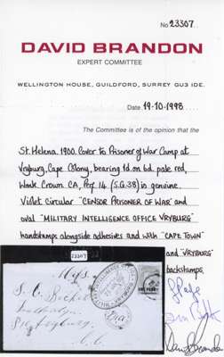 1900 cover addressed to POW Camp, bearing 1d pale red, tied by cds, with Military Intelligence Office Vryburg oval cachet for 25 JAN 1900, with Censored and initialled in red M/S, with Censored Prisoner of War cds below, backstamped by G.P.O Capetown cds for 21 Oct and Vryburgh cds for 23, couple of vertical creases, otherwise fine, a rare cover. Brandon Certificate (1998) SG 38