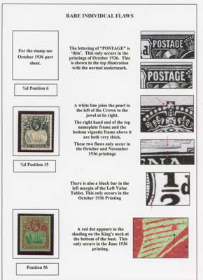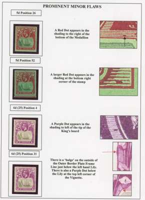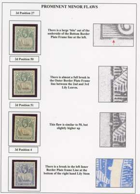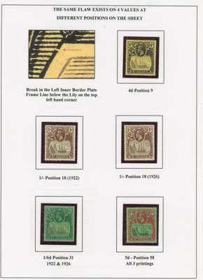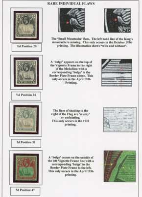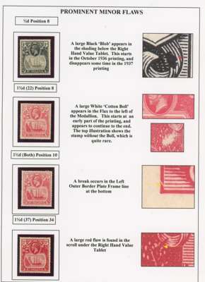 1922-37 Badge issue collection of ‘prominent minor flaws’, ‘minor flaws’ on individual values and ‘rare transient flaws’, on display pages, fully written up. Mostly affecting the frame, which of course has received less attention than the vignette. Some of the ‘minor’ flaws are substantial, such as the ½d Oct. 36 R1/8 large blob below right value, the 1½d R1/10 ‘cotton boll’ and the 5d 1927 R1/8 ‘full beard’; values to 7/6d (2) and a £1 with damage to ‘£’ sign (position not known). A terrific collection, full of interest and with some extremely scarce items