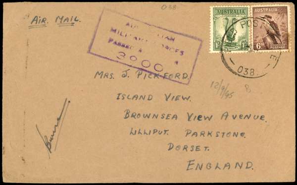 1945 envelope to Dorset bearing 6d and 1/-, tied by fine FIELD POST OFFICE 038 CDS of 12 SE, based at Miri at this time. Fair violet boxed AUSTRALIAN MILITARY FORCES PASSED BY CENSOR 3900, no tape or other markings, ex Proud