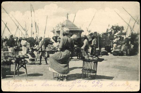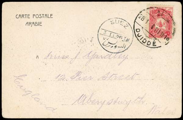 Saudi Ottoman Post Offices 1906 postcard to UK Djidde cds