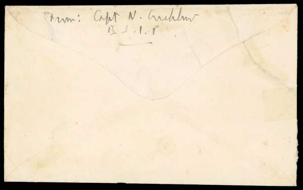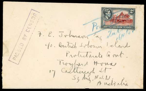 Postal History. 1942 envelope to Sydney with 2d cancelled by manuscript “Post Office/ Tulagi/ 16.4.42” in blue crayon, with boxed violet PASSED BY CENSOR at left, some reinforced tears, still fine