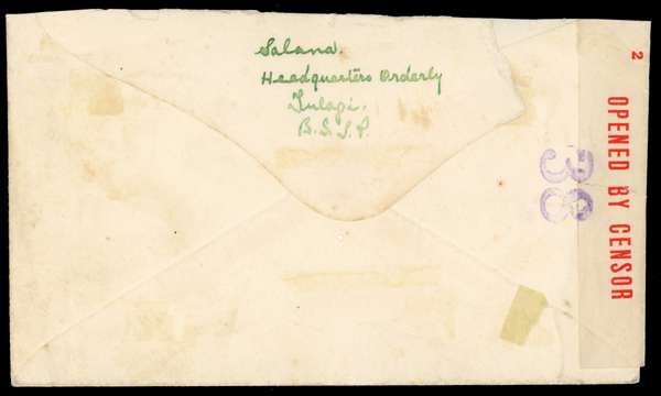Postal History. 1942 envelope to Auckland with 2d cancelled by manuscript “Post Office/ Tulagi/ 18.3.42” in blue crayon, with boxed violet PASSED BY CENSOR at left, with NZ censor label and cachet also on front