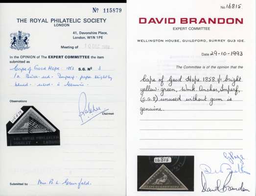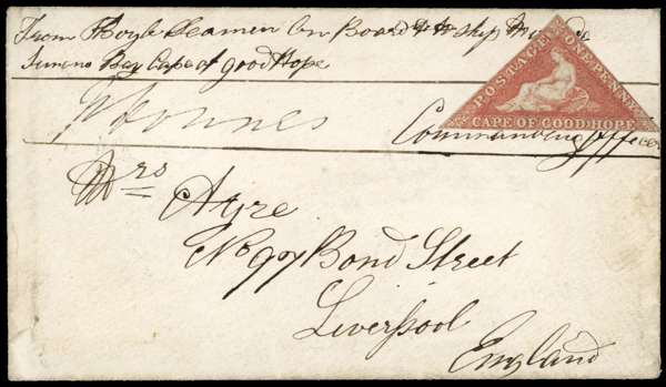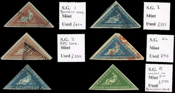 1853-63 mint and used collection of Cape Triangles arranged on stock page, including 1853 1d pale brick-red used (SG 1 cat £450 with Brandon Certificate), 4d deep blue (SG 2 cat £325), 1d brick-red (SG 3 cat £350 RPS Certificate), 1861 sailor's cover to England, countersigned by commanding officer, bearing uncancelled 1d brick-red (SG 3 with Brandon Certificate) 4d blue (SG 6x2) 1s bright yellow-green unused without gum (SG 6 cat £3750 Brandon Certificate), fair to fine condition, mostly with three margins. SG 1-6