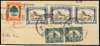 Officials. 1939 1/- brown and chalky blue strip of three on piece with single 6d and 1½d pair (the latter damaged). The left stamp (English) shows diaresis on the second E of OFFISSIEEL; the middle stamp has a closed tear, still a rare piece. SG O25c, £1500