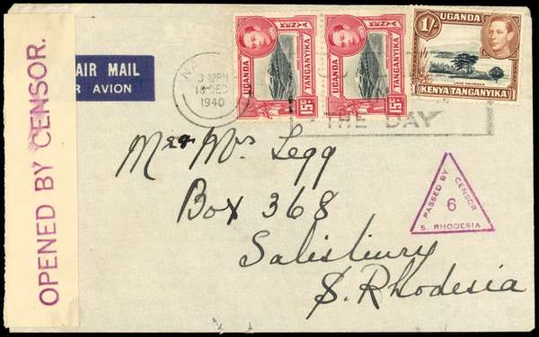1940 incoming envelope to Salisbury bearing KUT 15c pair and 1/-, Nairobi slogan of 18 DEC Censor tape at left with ink matching fine strike of small triangular PASSED BY/ CENSOR 6/ S. RHODESIA