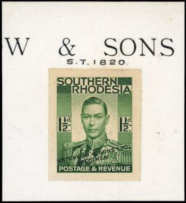1937 1½d imperforate sample stamp in green, affixed to part of a sample book page, numbered ‘S.T. 1820’ above the stamp, overprinted WATERLOW & SONS LTD./ SPECIMEN. Fine. SG 42