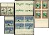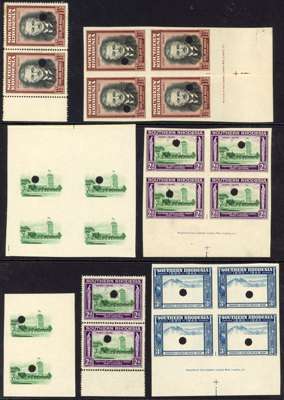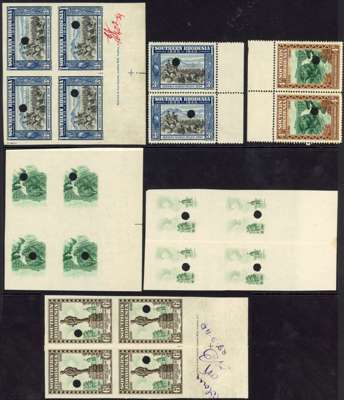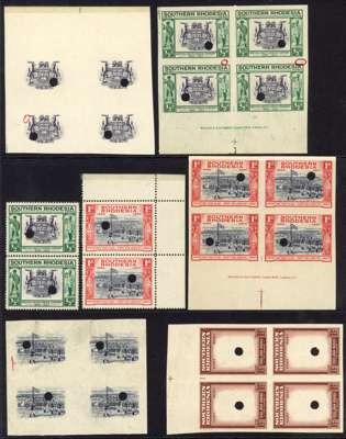 1940 BSACo plate proof collection. The set in imperforate blocks of four, either vignettes or frames only; complete designs also in imperforate blocks of four, the set, all being imprint blocks; perforated set in pairs. Some creasing, as often, and a little soiling; some ink annotations and red ink marking corrections. All impressions with medium security puncture. A good collection. SG 53-60
