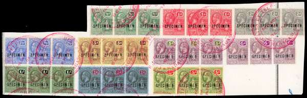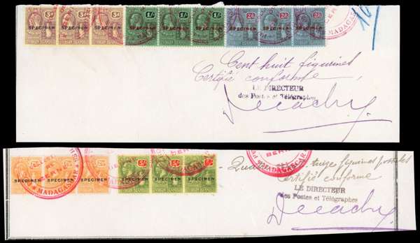 1922-7 set, both watermarks (less the 1d scarlet and 1½d Venetian red, issued later in 1928) in strips of three, overprinted SPECIMEN Types D12 or 16, on the original pieces from the Madagascar UPU ledgers. Two of the pieces are signed by the Director. Each strip is struck by the red POSTES ET TELEGRAPHES/ COLLECTION' DE/ BERNE/ MADAGASCAR handstamp. Unique and most desirable for exhibition. SG between 82s/101s