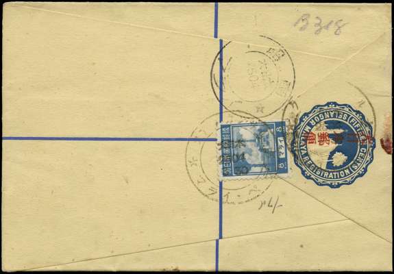 Selangor. 1944 use of 15ct blue registered postal staionery envelope. size G, red Kanji overprint, 8ct War Memorial added with Kuala Kangsar Type JD3 CDSs. Singapore arrival. Violet censor chop on front and bi-lingual registered label. Reduced at right. Tan RE16 (but overprint in red)