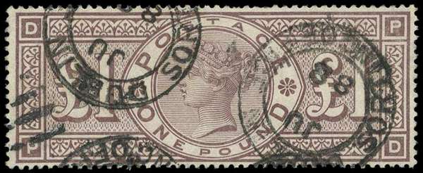 (GB used in). 1888 £1 brown-lilac watermark Orbs, with part of three DUBLIN SORTING OFFICE CDSs of JU 88, and part bars at left. Unusual with postal cancels. Several short perfs at top, unrubbed and with good colour. K-A Louis Certificate (2010). SG (GB) 186, £4500, MW K92