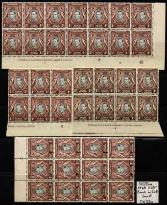 1942-6 1ct unmounted o.g. positional multiples. Plate 2-2-4B block of twelve with R9/6 damaged value tablet, and 10/8 'tadpole'; blocks of six and eight with R9/6 retouched tablet, red-brown and deep chocolate-brown shades; and block of twelve, R2/5 break in bird's breast (full state). SG 131ac, ad, ae, af, ah, £380